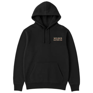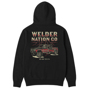 The Rigged Hoodie is for welders who treat their truck like a second shop. The back graphic shows a skeleton welder behind the wheel of a fully rigged setup, bottles, leads, and tools loaded and ready. Lightning in the background and 0.1% printed below. It is the welder version of pulling up and getting it done.